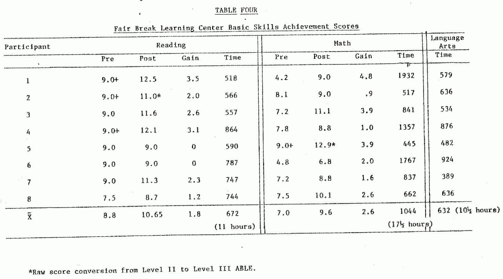 The second paragraph tells us that Level 3 of ABLE was in fact used in the Fair Break project as a post—test, but not as a pre-test: "...it is still impossible to establish a grade level gain when the pre test is inaccurate." Again, in paragraph 3 we find that times were not recorded for the St Paul students: "...staff had to look at group records and guess at the amount of time spent in each curriculum. In some cases, it was just too difficult to determine,". No blanks appear in Park's Table 4, and the same figure (11 hours) is quoted by both Rizza and Walker-Hunter (published January 1979) and Caldwell and Rizza (1979, no month, but submitted to ERIC in late 1979, on the basis of clearinghouse accession numbers). Walker—Hunter's memo is dated 7th March, 1979.